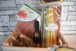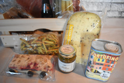 stevig kistje, multifunctioneel in gebruik, gevuld met echte italiaanse parmaham, luxe pasta, pot pasta tapenade, grissini, italiaanse olijfolie, italiaanse notat, italiaanse kruidenkaas, een flesje prosecco, zakje italiaanse ammarettikoekjes in chocolade.